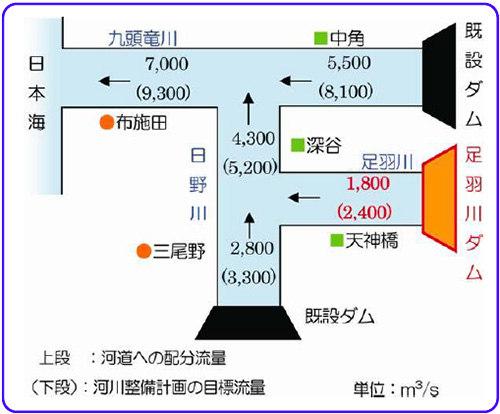 また、策定から20年~30年の河川の整備内容を定めた九頭竜川水系河川整備計画(平成19年)においては、 目標である戦後最大規模の洪水(福井豪雨規模)の流量2,400m3/sに対して、600m3/sを 足羽川ダムにより洪水調整を行うこととしています。