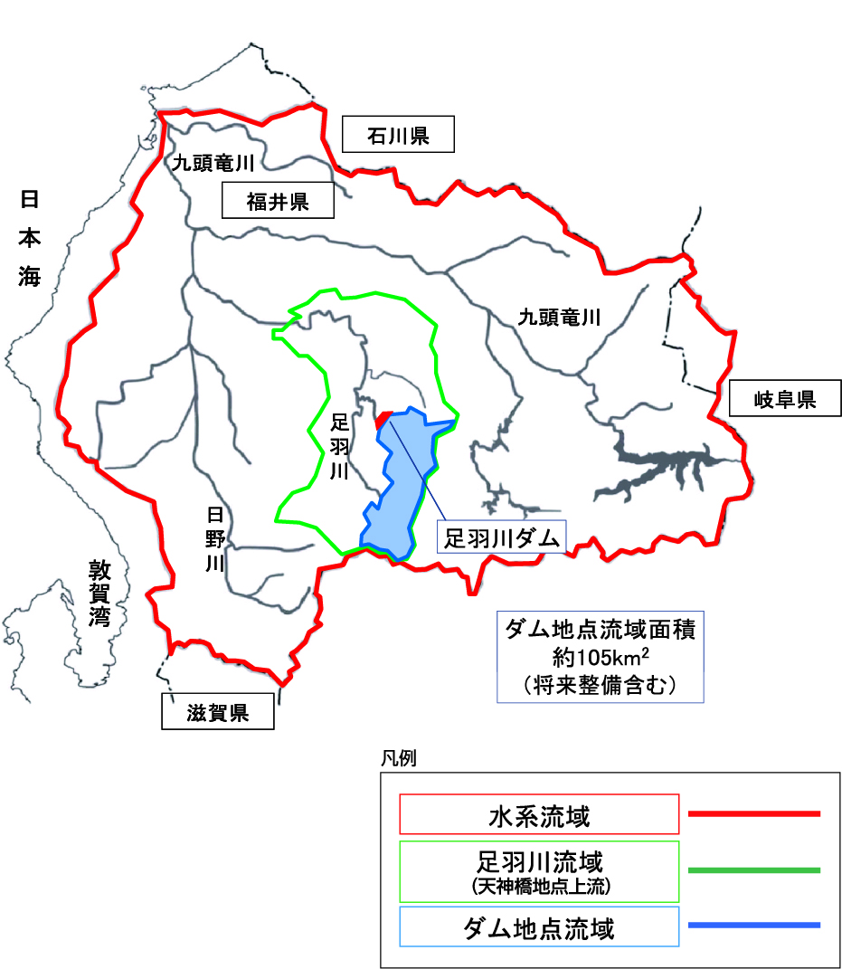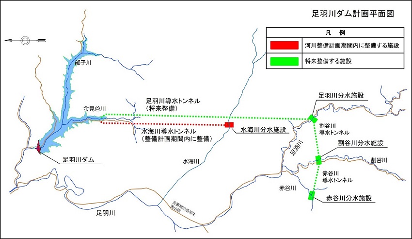 足羽川ダム建設事業は、足羽川、日野川(ひのがわ)及び九頭竜川(くずりゅうがわ)の 下流地域における洪水被害の軽減を目的として、 九頭竜川水系河川整備基本方針に定められた天神橋(てんじんばし)地点の 基本高水のピーク流量3,100m3/s に対し、800m3/s の洪水調節を行うため、 洪水調節専用(流水型)ダムと併せて、2本の導水トンネルにより 他の4 河川(水海川(みずうみがわ)、足羽川、割谷川(わりたにがわ)、赤谷川(あかたにがわ)) の洪水を導水するための分水施設(分水堰と導水トンネル)を整備するものです。
