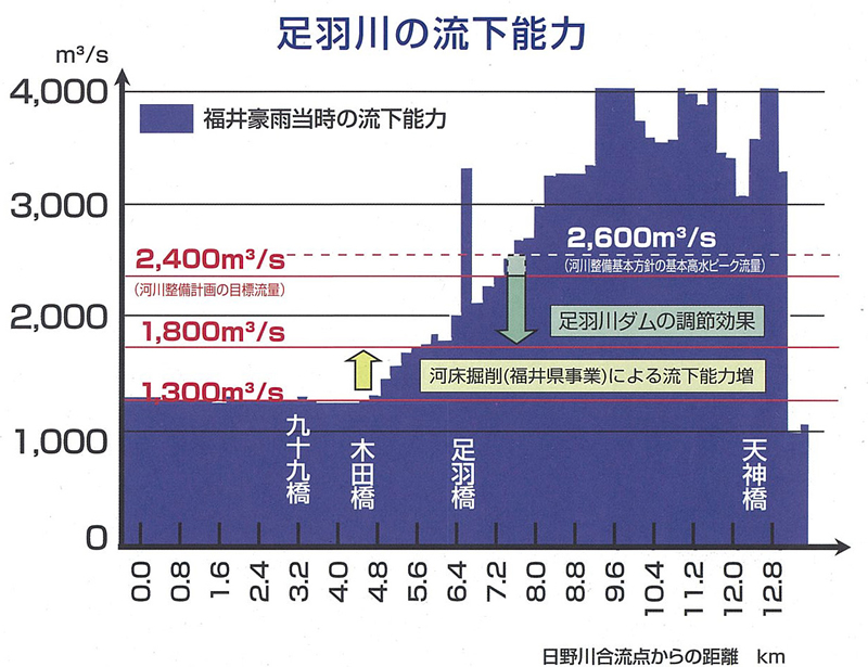 福井豪雨時の足羽川(福井市街地を流れる区間)は、 川幅が狭く、洪水の流下を阻害する橋梁が存在したこともあり、 約1,300m3/s の洪水を安全に流せる能力しかありませんでした。