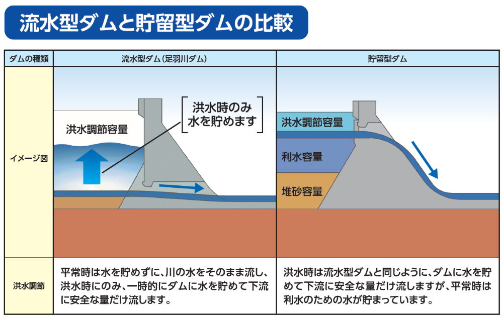 平常時は水を貯めず、川の水をそのまま流し、洪水時のみ、一時的にダムに水を貯めて下流に安全な量だけ流します。