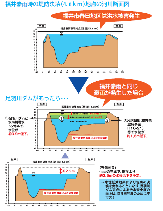 また、九頭竜川(くずりゅうがわ)、日野川(ひのがわ)、足羽川の河道改修と足羽川ダムをあわせて整備することにより、堤防の決壊地点での水位は約2.5m低下すると推定され、福井豪雨での被害は、さらに低減されていたと考えられます。