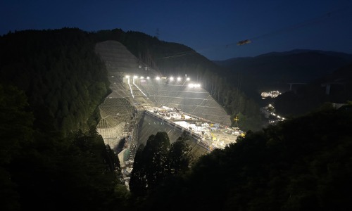 ダム本体が工事が最盛期を迎えているライトアップされた幻想的な工事現場は普段体感することができない圧巻のスケール感です。