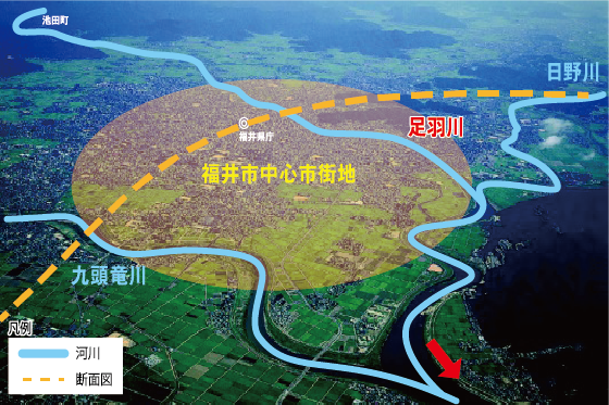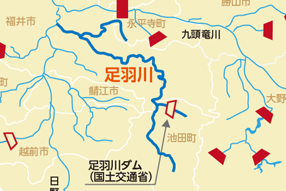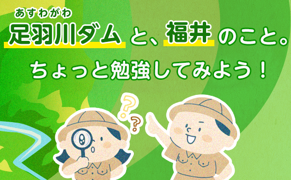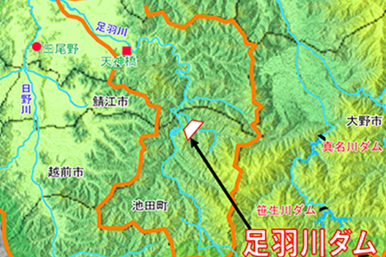 足羽川ダムは、足羽川、日野川(ひのがわ)、九頭竜川(くずりゅうがわ)下流地域における 洪水被害の軽減を目的として、 九頭竜川水系足羽川の支川部子川(へこがわ)(福井県今立郡池田町小畑地先)に洪水調節専用のダムと併せて、 他流域の4河川(水海川(みずうみがわ)、足羽川、割谷川(わりたにがわ)、赤谷川(あかたにがわ)) の洪水を導水するための分水施設(堰・導水トンネル)を整備するものです。