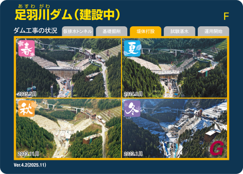 足羽川ダムは、福井豪雨のような水害を繰り返さないために、上流で洪水を調節するダムで日本最大規模(ダム高、堤体積、洪水調節容量)の流水型ダムです。