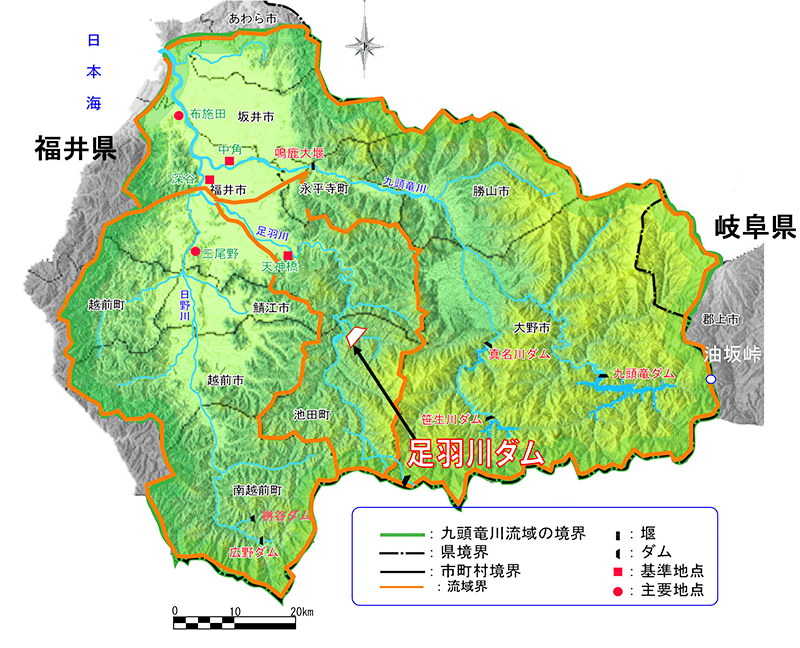 足羽川は、九頭竜川(くずりゅうがわ)水系日野川(ひのがわ)の支川で、流域面積415.6、幹川流路延長61.7kmの1級河川です。その源を福井県と岐阜県の県境の冠山(標高1,257m)に発し、山間部を曲折しながら池田町を北流し、途中、中小支川を合流しながら福井市小和清水町で流向を北西に転じ、天神橋(てんじんばし)地先で平地に出て福井市街地を貫流し、福井市三郎丸地先で日野川に合流しています。