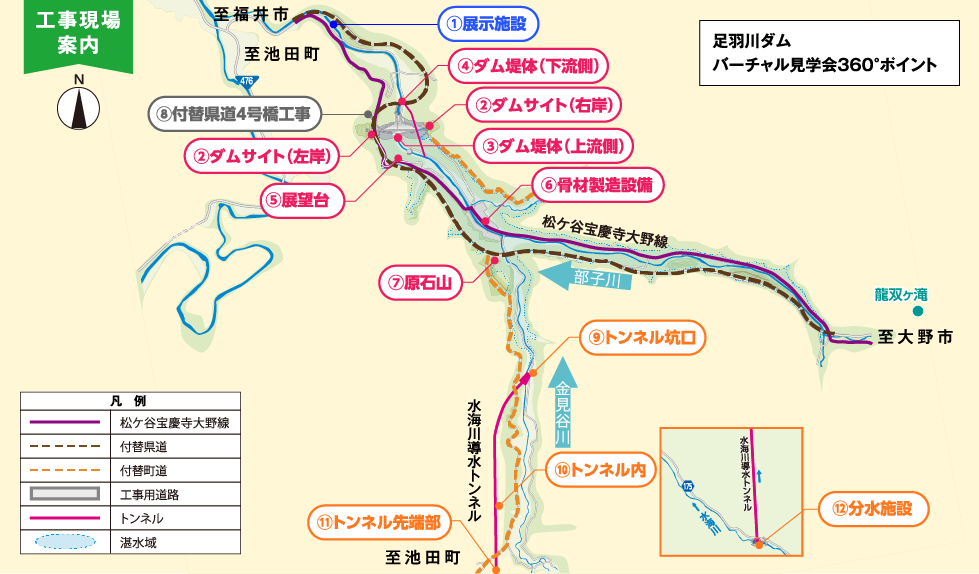 | ⑨トンネル坑口 | トンネル吐口 | 洪水時に水海川の水を足羽川ダムへ導水するためのトンネルです。全長約4,7kmあり水を吐き出す出口となります。工事はここを起点に一方向から掘り進めています。 | トンネル坑口2023年8月時点 |
