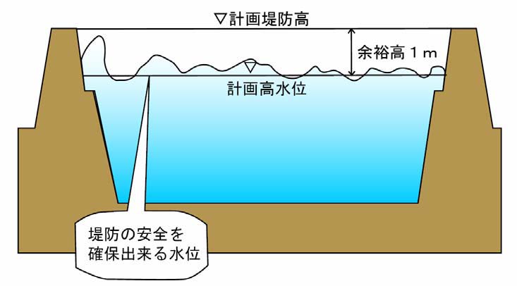 洪水を安全に流せる水位としてはん濫危険水位を設定し、これに余裕高を加えたものを堤防高としますが、洪水時の風浪、うねり、跳水等による一時的・局所的な水位上昇や、流木等の流下物が橋等に引っかかることにより、洪水が堤防を越えないようにするために堤防の構造上の余裕として余裕高が必要です。また、洪水時の河川の巡視や水防活動を実施する際の安全性の確保などの観点からも余裕高が必要であり、このような様々な観点から余裕高が必要です。従って、余裕高の役割・目的を達成し堤防の安全性・機能を確保するためには、余裕高を使って洪水を流すことは適当ではありません。