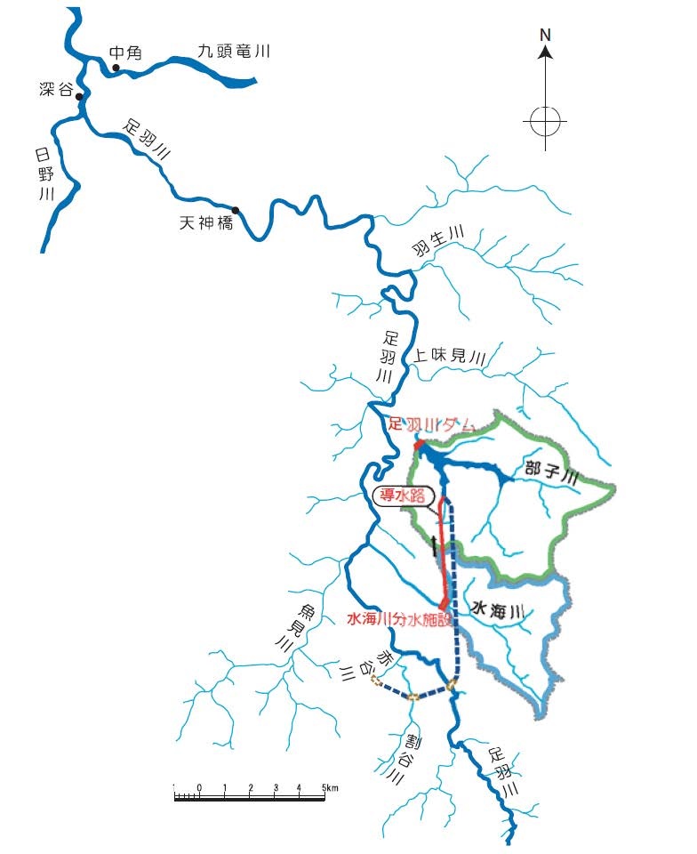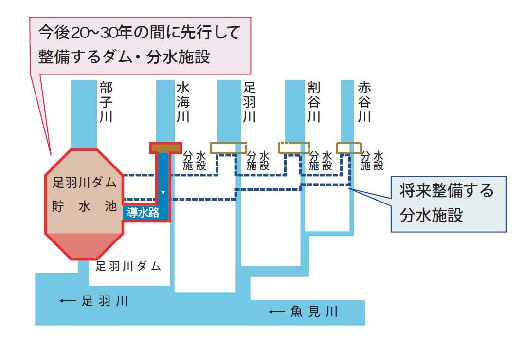 分水施設(導水トンネル)については危機管理や洪水調節機能の確保の観点から、水海川と他3河川からの導水トンネルを別々とし、そのうち水海川導水トンネルを整備計画に対応した規模で先に建設する計画です。