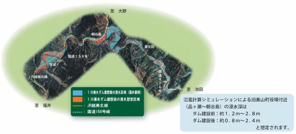 足羽川ダムは上流部でも効果を発揮し、足羽川ダム計画のうち当面整備を予定しているダム本体と水海川からの導水トンネルが完成すれば、福井豪雨のときに床上・床下浸水等の被害にあった区域は大幅に減少すると想定されます。