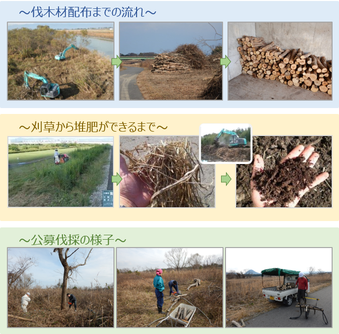 琵琶湖河川事務所では、河川の適切に維持管理していくために河川の堤防の除草・支障となる樹木の伐採を行っています。 このような管理により発生した草木を有効活用し、処分費等のコストを縮減することを目的として、リサイクル資材(堆肥・伐木材)の配布を行っています。 また、河川内に生育する樹木を希望者自らが伐採し利用していただく「公募伐採」の取り組みも実施しています。河川の資源の有効利用に興味がある方は以下よりお申し込みください。