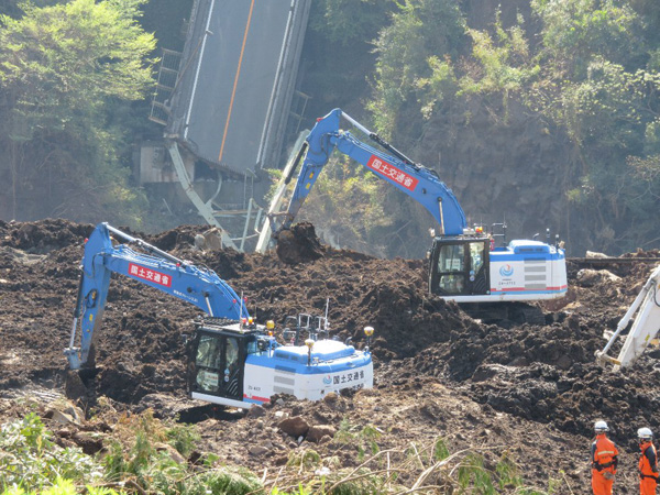 | 分解してのヘリでの空中輸送や、遠隔操作による応急復旧作業が可能。 被災状況により大型の建設機械が陸上輸送できない場合や、復旧作業で二次災害の危険性がともなう場合などに活躍します。 |