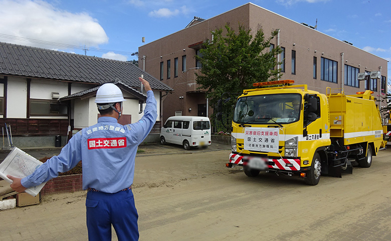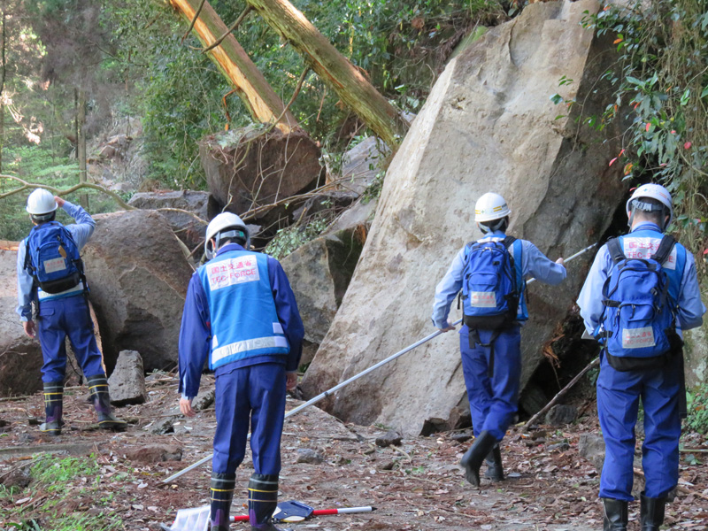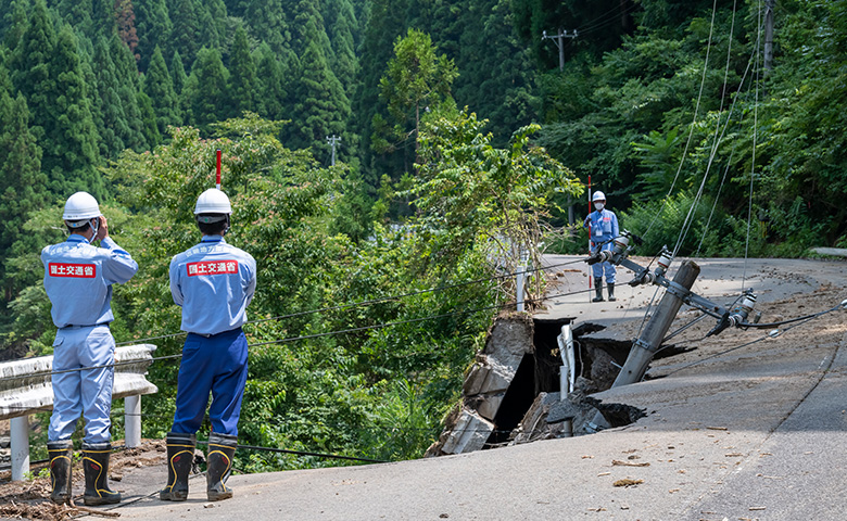 TEC-FORCEは、その技術力を活かし、台風や豪雨、そして地震や津波、火山の噴火などの大規模自然災害が発生して自治体職員だけでは対応が難しい場合に、いち早く被災地に出向き、被災した自治体を応援・支援します。