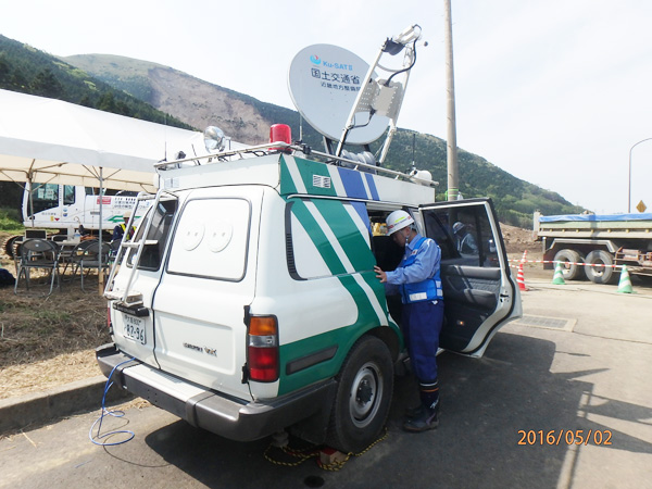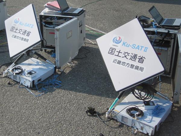 | 衛星通信車、可搬型の衛星アンテナ(Ku-SAT)を用いて、被災箇所の映像情などを被災自治体を含む関係機関に伝送。 映像伝送だけでなく、通信が遮断した被災地における通信回線の確保にも活躍します。 |