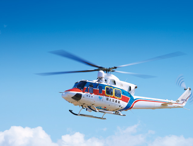 | 広範囲にわたって被害が発生した場合、上空からの調査により全容を把握します。 上空から撮影した映像はリアルタイムで伝送可能。 |
