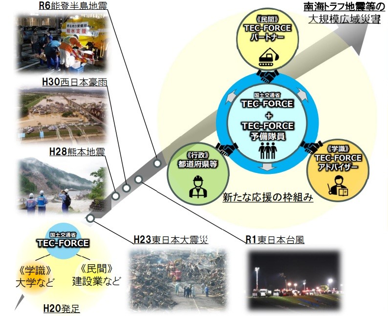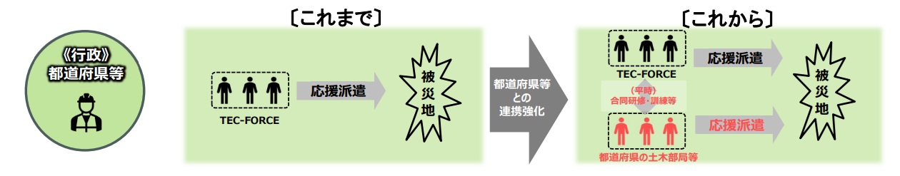 令和7年6月4日の「災害対策基本法等の一部を改正する法律」の公布・一部施行を受け、緊急災害対策派遣隊(TEC-FORCE)の増強と行政機関・民間企業・学識者などの専門性を持った多様な主体との更なる連携強化により、被災自治体への新たな応援体制を構築していきます。