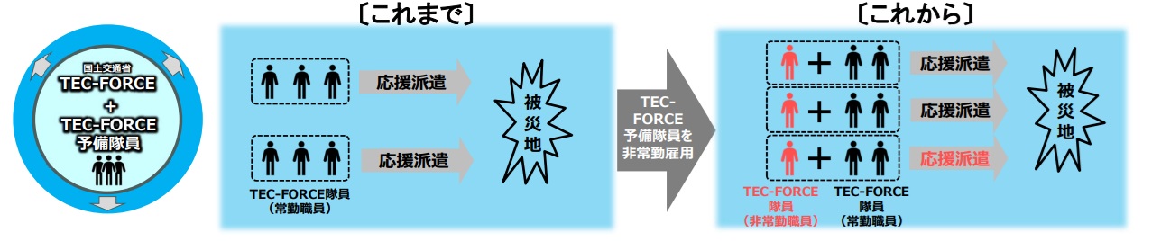 新たに創設する「TEC-FORCE予備隊員」制度により、専門的な知識を有する民間企業等の人材を募集・採用し、災害時に国家公務員(非常勤職員)として被災地に派遣することにより、TEC-FORCEとしての応援体制の強化を図ります。