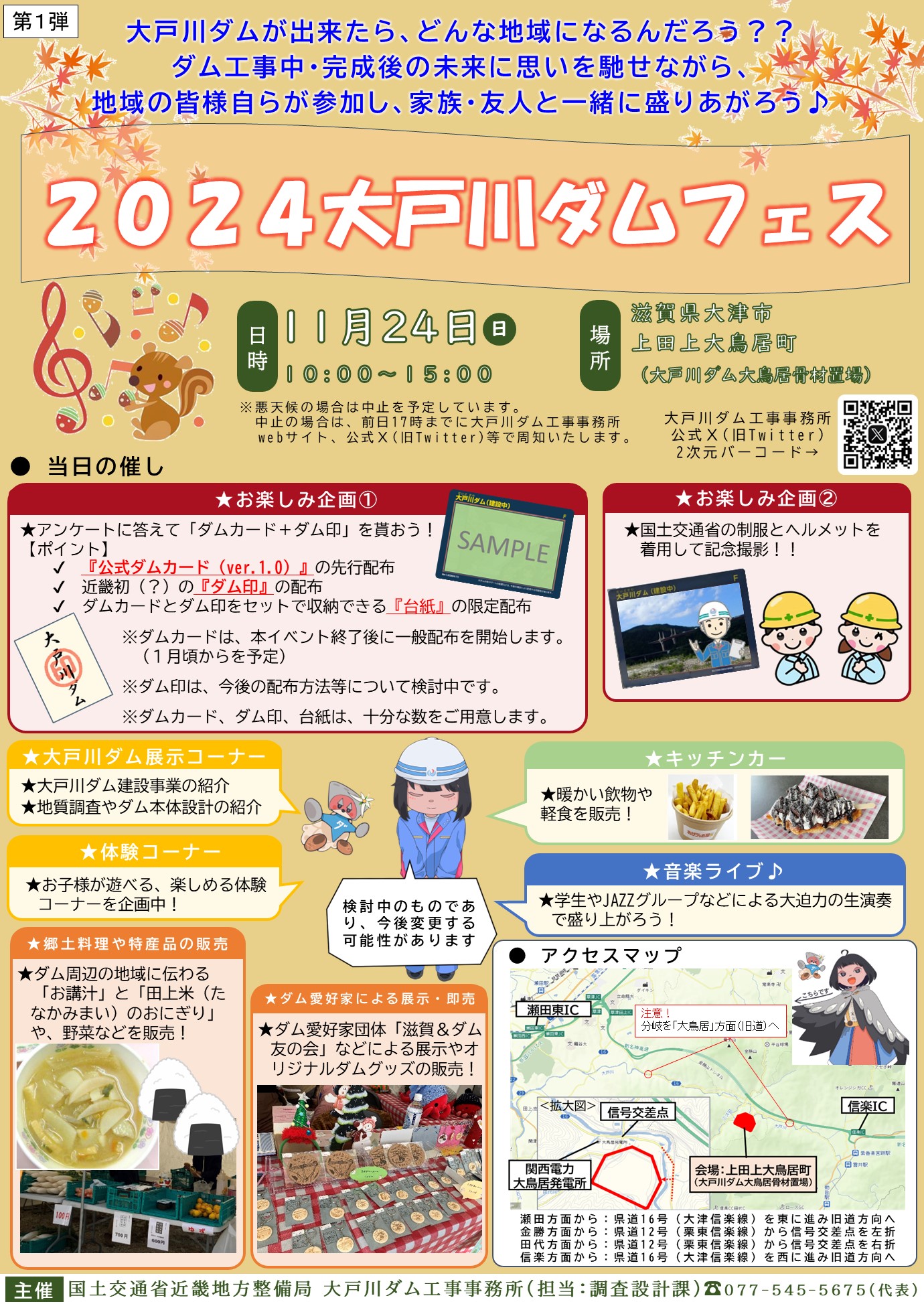 大戸川ダムに関する展示、ダム周辺地域の郷土料理や特産品の販売、ダム愛好家による展示・即売会、学生やJAZZグループなどによる大迫力の音楽ライブなどを開催します