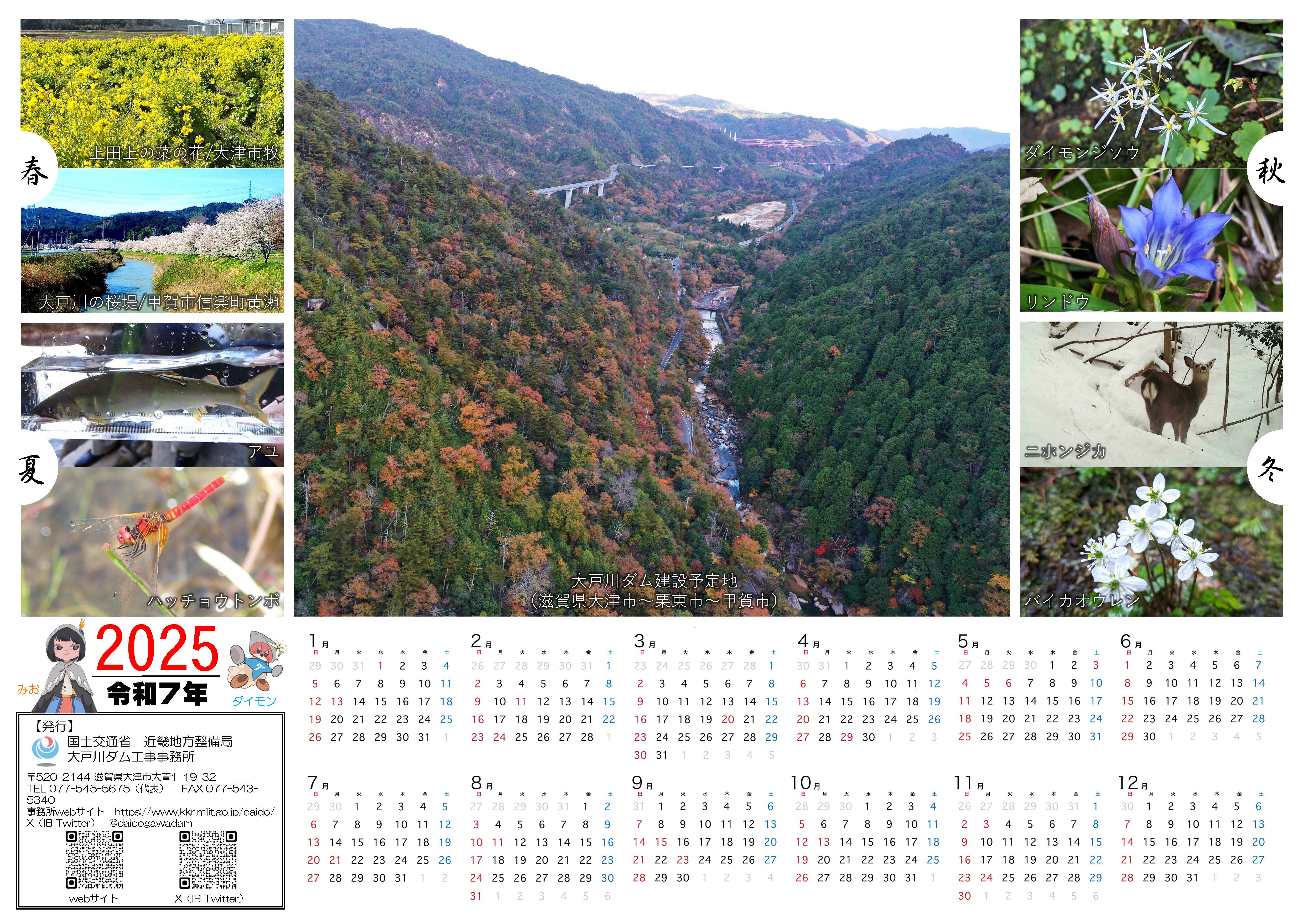 2024.12.02 「ダムカレンダー2025」を作成しました 画像をクリックするとPDFファイルが開きます 「大戸川ダムカレンダー2025」を作成しました。 ダム上下流の地域や事業区域などで撮影した四季折々の写真を使用しています。 ぜひご活用ください。 画像ファイル(JPG)のダウンロードはこちら(パソコンの壁紙などにご活用ください)