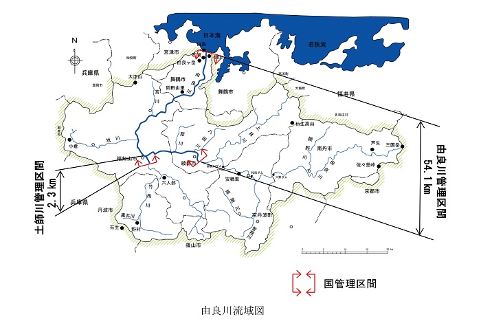 河川については、由良川の河口から綾部市までの54.1km、同支川土師川の2.3kmの56.4kmを管轄しています。