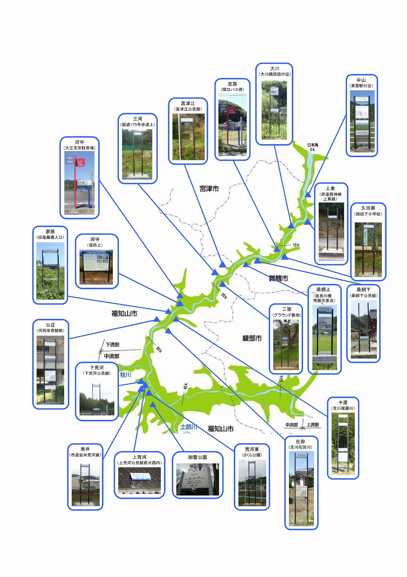 | ・桑飼上(由良川橋南詰交差点 | ・高津江(高津江公民館) | ・三河(国道175号歩道上) |