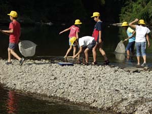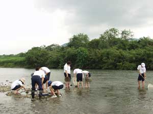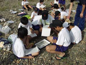- 班ごとに分かれて川に入り、石にくっついていたり、川底にいる生きものを探す。