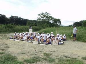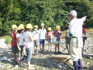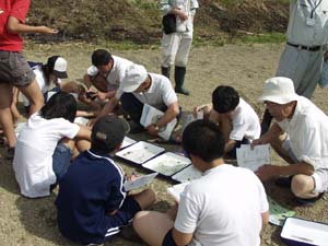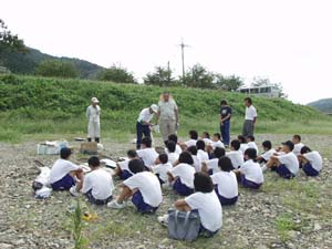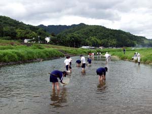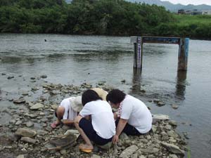 | 調査を予定していた日が雨によって2度も中止となり3度目の正直!ていうことで、ようやく9月の晴れた日に、福知山市立成仁小学校4年生の皆さんと由良川水系由良川の私市付近で調査を行いました。 今回の調査結果では、少しきたない水にすんでいる生物が多くみられました。 |