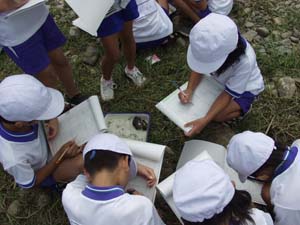 - 2グループに分かれて「生きものの種類と数調べ」と「パックテストによる水質調べ」を交互で行う。