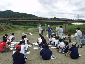 | 8月の良く晴れた日に、福知山立南陵中学校理科クラブの皆さんと由良川水系由良川の音無瀬橋下流付近で調査を行いました。 今回の調査では、ナガレトビケラやヒラタカゲロウが多くみられました。 「去年と比べてヒラタドロムシが減った気がする。」という意見を貰いました。 |