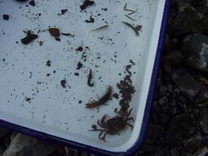 | まだ暑さの残る9月の終わりに、綾部市立東陵中学校1年生の皆さんと由良川水系上林川十倉橋付近で調査を行いました。 各班、真剣に採取し様々な生物を見つけることができました。 今回の調査結果では、カワゲラ、ナガレトビケラ、ブユなど、きれいな水にすむ生きものが多くみられました。 |