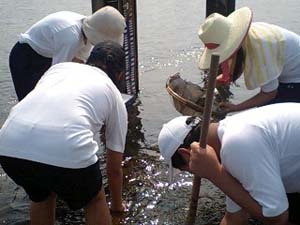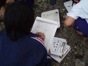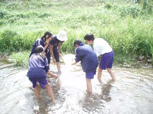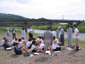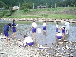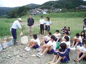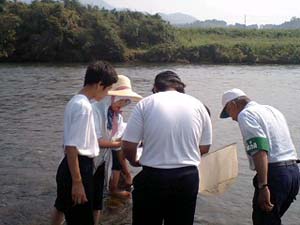| 上林中学校では、上林川を美しくする会の皆様とともに、水生生物調査に取り組んでおられます。 川の水の調査をすることで自然と人間との関りを学ばれています。 実施日:平成18年6月16日 場所:由良川水系上林川大手橋付近 水質の判定:Ⅰ(きれいな水) |