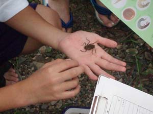 - 班ごとに分かれて川に入り、石にくっついていたり、川底にいる生きものを探す。