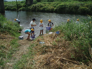 由良川水系上林川大手橋付近で水生生物調査を行いました。 虫や魚のとり方を教えてもらい、たくさんの生き物を見つけることができました。今年は水質階級Ⅱのヒラタドロムシがふえていました。調査結果は昨年と同じ「水質階級Ⅱ 少しきたない水」でした。