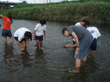 ![]() 石をひろって、生き物がくっついていないか探します。 |