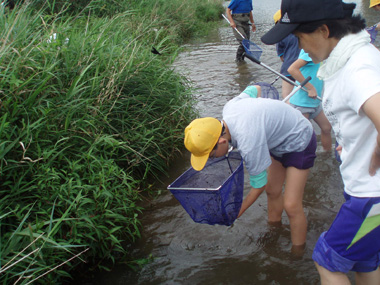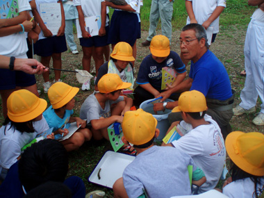 ![]() 先生から虫や魚の名前や特徴を教えてもらいながら、結果を書きこんでいしました。 |