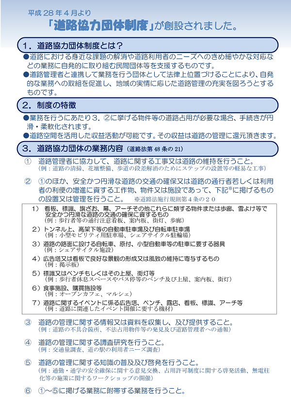 道路協力団体制度とは、道路における身近な課題の解消や道路利用者のニーズへのきめ細やかな対応などの業務に自発的に取り組む民間団体等を支援するものです。