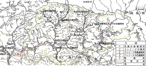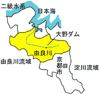 由良川は、大野ダムから下流では、上和知川・高屋川・上林川等を合わせて綾部市を流下し、さらに福知山市において土師川と合流して北に流れを転じ、大江町を通過して舞鶴市、宮津市の境界を流れ日本海にそそいでいる。