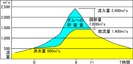 洪水調節は右図のとおりで、洪水量が毎秒500m3を越える場合は、流入量の58%を放流し42%を貯留することとしている。