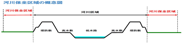 「河川保全区域」とは、堤防等を守るため、一定の範囲について行為を規制する区域のことです。「河川保全区域」内で、住宅を新改築したり、穴を掘ったり、土を盛ったりする際には許可が必要となる場合があります。