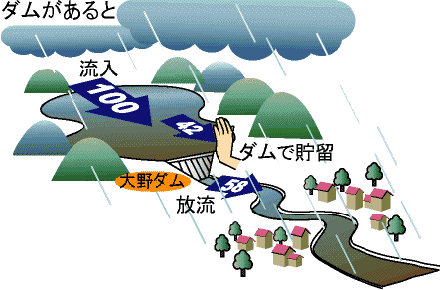 | 大野ダムは、洪水調節と発電を目的とした多目的ダム(京都府管理)であり、下流の福知山地点で900m3/sの洪水調節を行う施設として昭和36年に完成している。 |