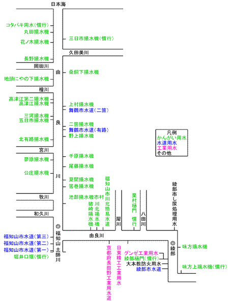 由良川水系全体における利水状況は、許可水利権が39件、許可権量が約107.3m3/sであり、そのうち発電用水としての利用が大部分で95.9%を占め、かんがい用水が2.4%、水道用水1.2%、工業用水0.5%となってます。