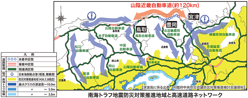 | 日本海側には高速道路の代替路が無く、災害時の復旧活動等に支障。 山陰近畿自動車道の整備により、日本海国土軸が形成され、災害等に強い道路ネットワークを構築。 |