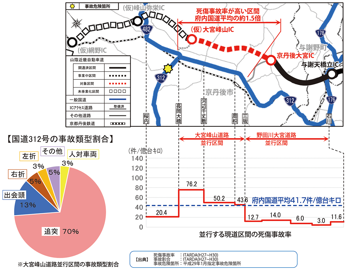 | 国道312号(対面2車線)は観光シーズンなどに速度低下が著しく、交通事故(府内国道平均の1.5倍の死傷事故率)も深刻。 |