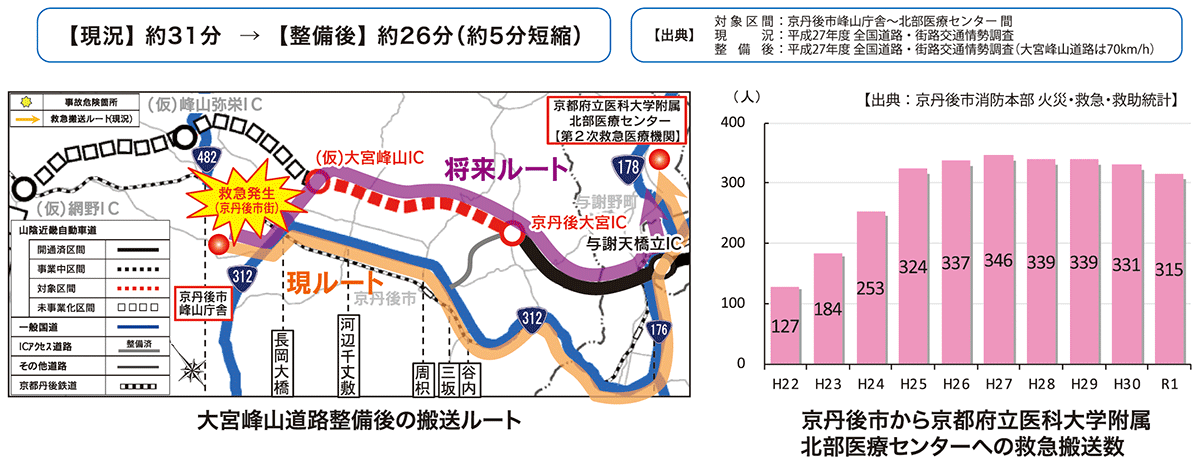 大宮峰山道路は、山陰近畿自動車道の一部区間を構成し、国道312号の交通混雑の緩和、日本三景の天橋立と日本海沿岸部を周遊する観光ルートの強化を目的とした延長5.0kmの事業です。