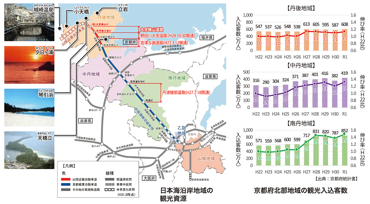 | 丹後地域には、天橋立や琴引浜をはじめとする魅力的な観光資源が点在。 山陰近畿自動車道が整備されると、日本海沿岸地域の観光資源を繋ぎ、周遊性が向上し、観光客数の増加に寄与。 |