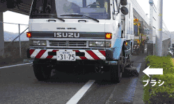 車の下に2つのブラシがついていて、それを回転(かいてん)させて掃除機(そうじき)のようにゴミや土を吸いとります。