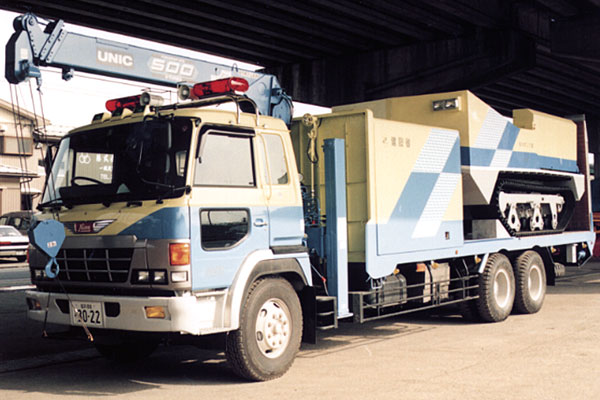 台風(たいふう)や大雨で川が洪水(こうずい)になったときに出動(しゅつどう)します。 この車は、家や道路が水浸(みずびた)しになったときに、強力(きょうりょく)なポンプを使って水を排水(はいすい)します。1時間で25mプール9杯分の水を排水(はいすい)できます。