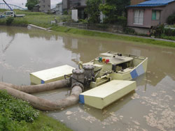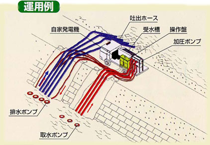 災害発生すると駆けつける車たち:川(かわ)に排水(はいすい)する