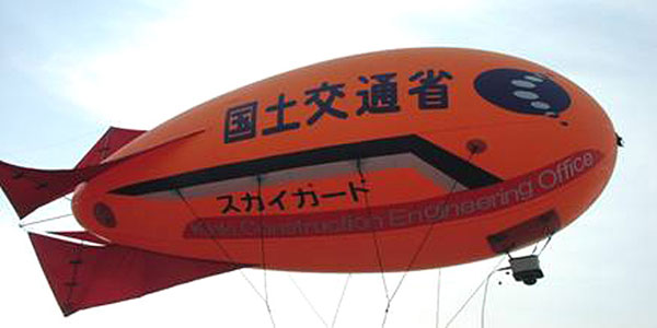 上空(じょうくう)から災害(さいがい)の状況(じょうきょう)をカメラやビデオを使って撮影(さつえい)します。リモコンを使って、地上(ちじょう)から操縦(そうじゅう)しています。