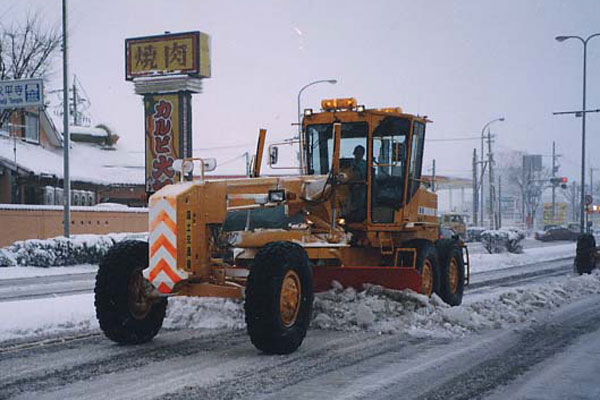 おなかについているブレードで、道路上(どうろじょう)のふまれてかたくなった雪を 削(けず)りとって道路(どうろ)のはしによせています。雪でデコボコになった道路を平(たい)らにしたりして車が走りやすいようにします。