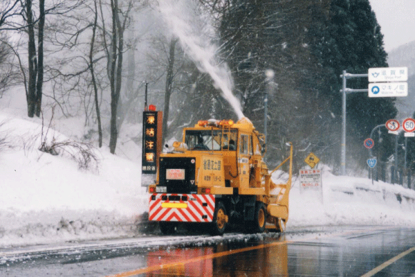 前面(ぜんめん)のオーガを回転(かいてん)させ、雪をかきこみ、雪を遠(とお)くへ吹きとばします。 大雪のときや道路の上に大量(たいりょう)につもった雪を取りのぞくときに活躍(かつやく)します。